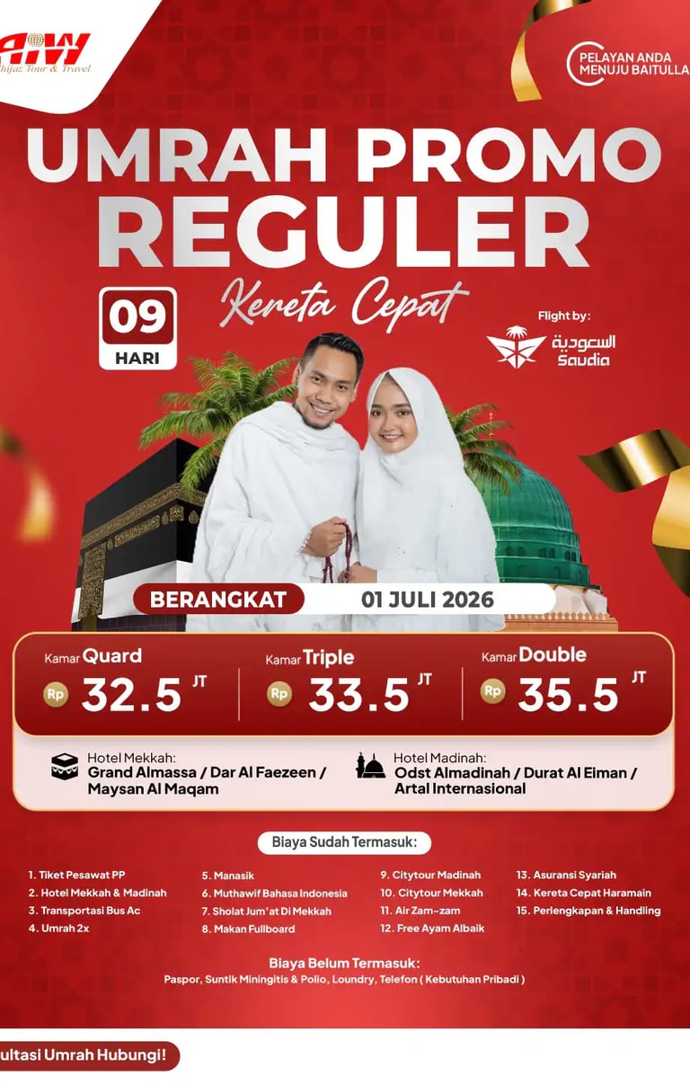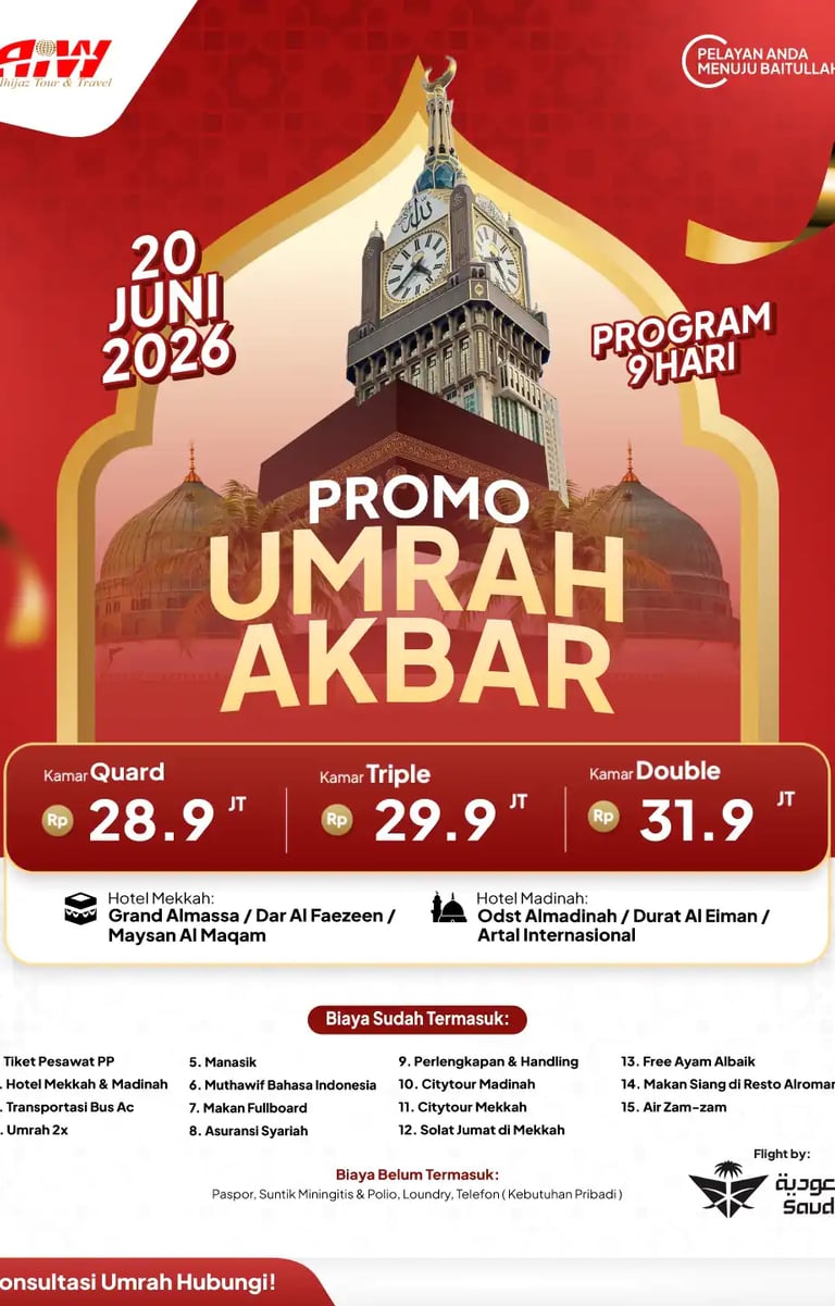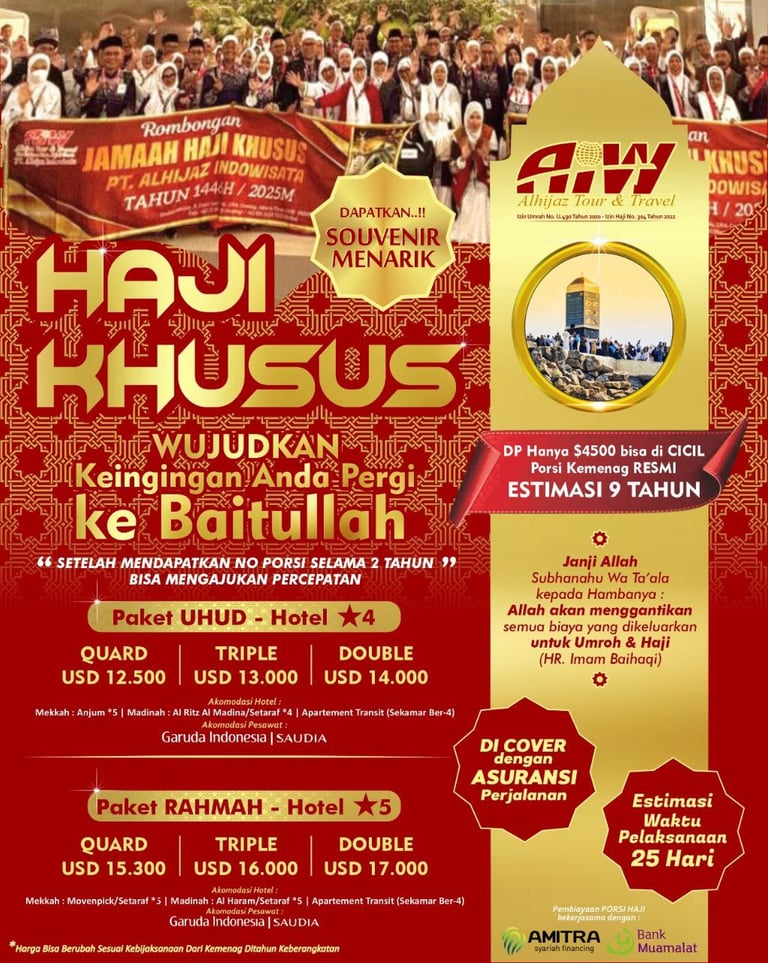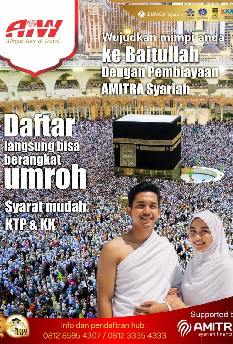 Info layanan paket haji khusus dan umrah Alhijaz Indowisata bisa Anda dapatkan dengan menghubungi konsultan haji khusus dan umrah melalui WA, email atau bertatap muka langsung. Cukup infokan no KTP dan membayar DP paket yang dipilih. Selanjutnya Alhijaz akan membantu Anda mewujudkan niat suci berhaji/umrah
